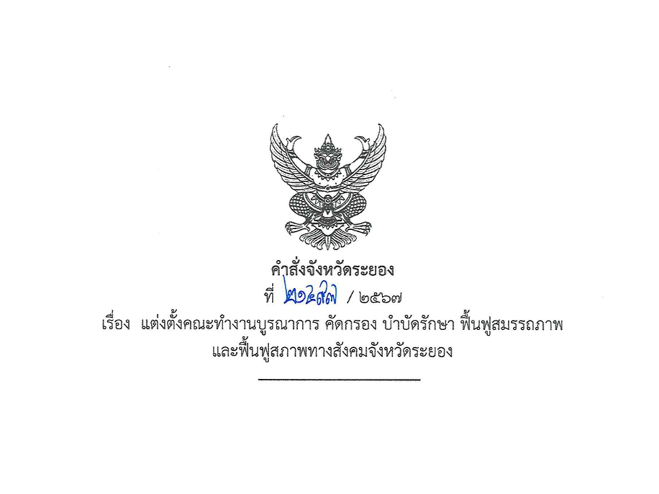 คำสั่งจังหวัดระยอง เรื่อง แต่งตั้งคณะทำงานบูรณาการ คัดกรอง บำบัดรักษา ฟื้นฟูสมรรถภาพ และฟื้นฟูสภาพทางสังคมจังหวัดระยอง